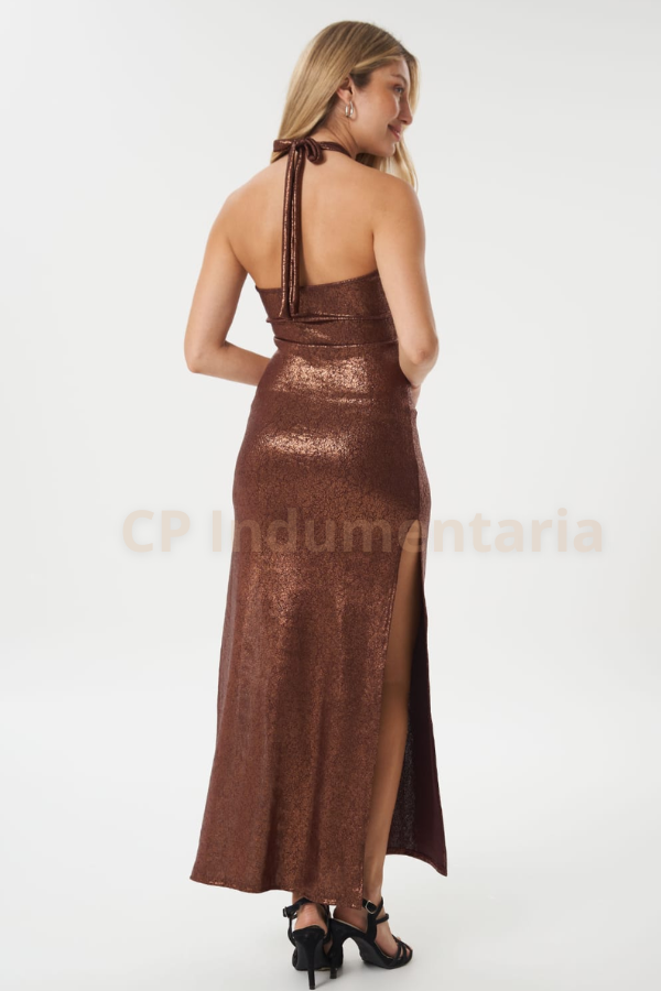Vestido largo de ficrofibra con foil (efecto quebrado) escote cruzado con lazo para atar atras. Doble tajo lateral, Talle unico.