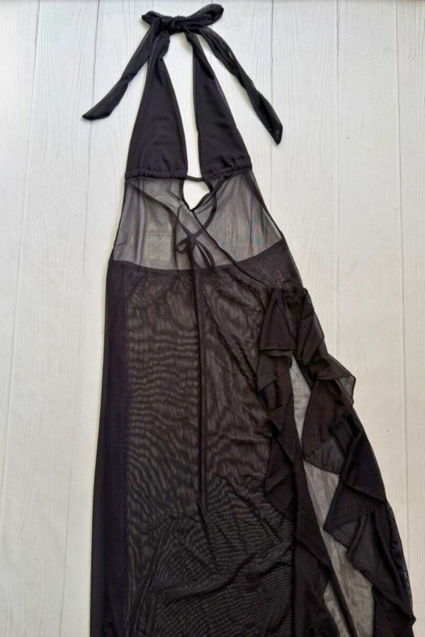 Vestido largo confeccionado en tul transparente, ideal para un look elegante y audaz. Su diseño halter con lazos para atar al cuello realza la parte superior, mientras que la caída fluida estiliza la silueta.